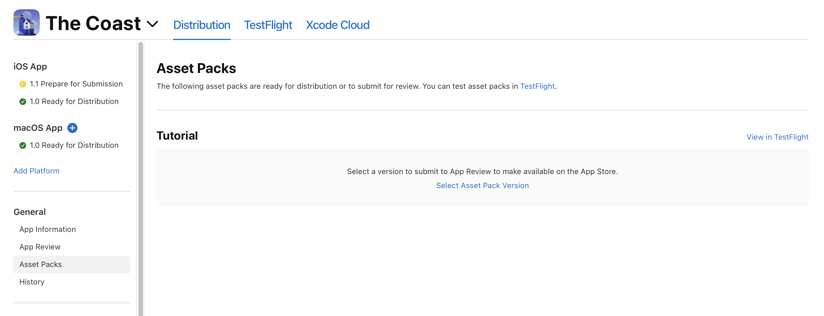 Asset packs must be reviewed before they can be tested externally in TestFlight or made available for users on the App Store. Learn about submitting asset packs for external testing.