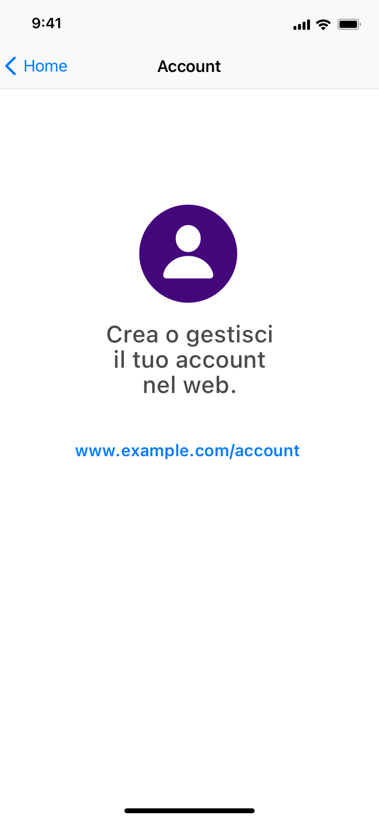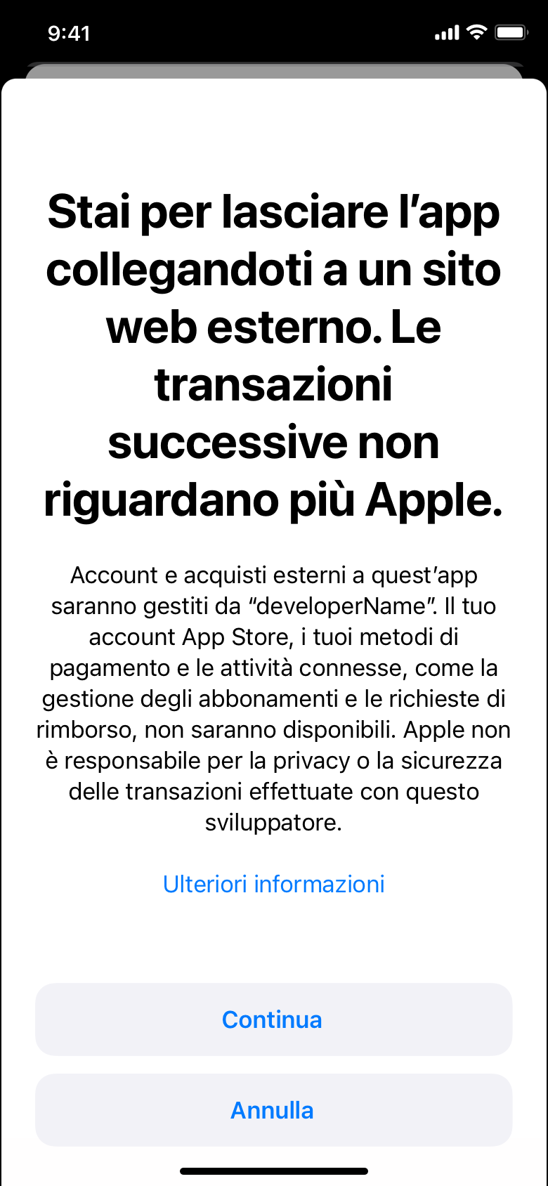Segui le informazioni per la pagina modale. Per iOS 16 e/o iPadOS 16 o versioni successive e tvOS 16.4 o versioni successive, questo meccanismo viene attuato tramite l’API per account con link esterno. Per i dispositivi con versioni precedenti di iOS e iPadOS, sarà necessario implementare la pagina modale seguendo esattamente il design e il testo illustrati di seguito.
