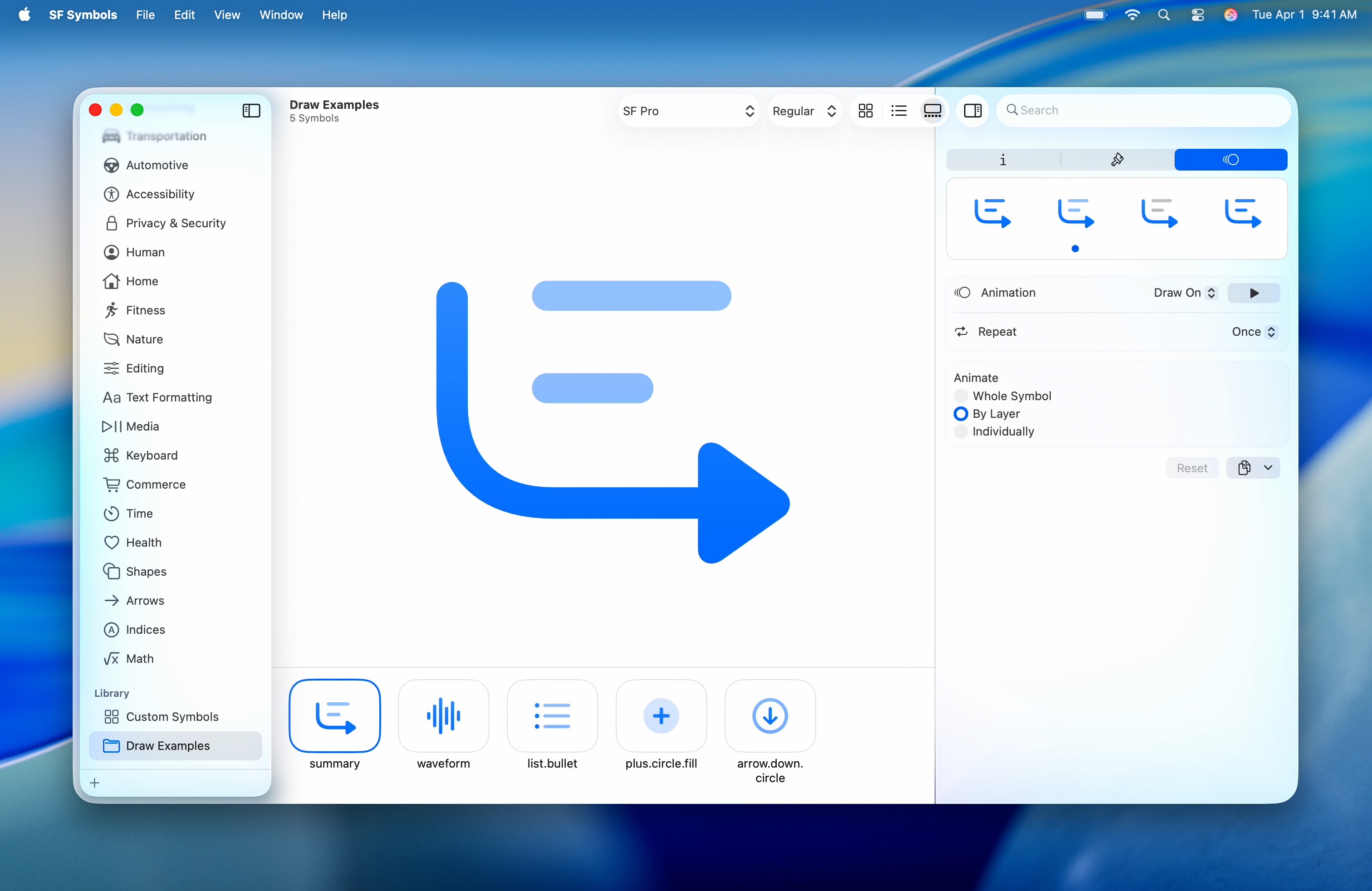 SF Symbols 7には6,900を超えるシンボルが用意されており、AppleプラットフォームのシステムフォントであるSan Franciscoとシームレスに統合できるようデザインされています。9段階のウェイトと3段階のスケールで利用できるシンボルは、テキストに対して自動的に調節されます。また、ベクターグラフィックスツールに書き出して編集できるため、同じデザイン上の特徴とアクセシビリティ機能を備えたカスタムシンボルを作成できます。SF Symbols 7では、Drawアニメーションと可変レンダリングが導入され、マジック置換が強化されました。さらに、グラデーションおよび数百の新しいシンボルが追加されています。