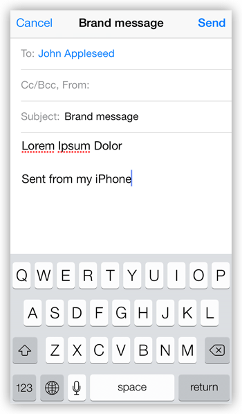 If your app has email, present a standard email composition view to users so that they can send messages without leaving the ad. You can prepopulate the system-provided composition view with content in the subject line or message body, as shown in Figure 3-9. Remember that your email message can be plain text or HTML.