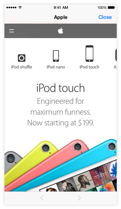 Your ad can direct users to pages outside of your ad. The page is displayed within the ad in an in-ad web view for users of iOS 7.0 and later (see Figure 3-10). When users have finished browsing, they can return to the ad by tapping the close button.