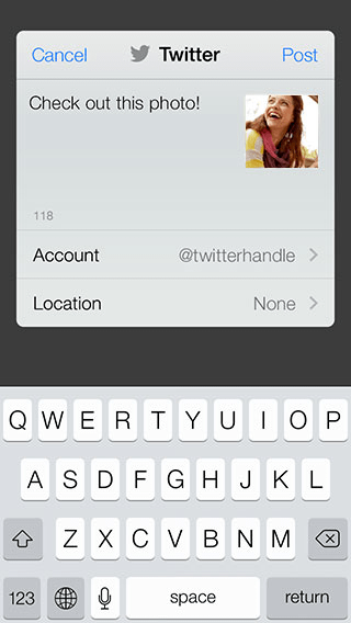Users can save the photo to their Camera Roll or save as a wallpaper. They can share photos and videos via Twitter, email and SMS/iMessage, or upload them to a server through a third-party API.