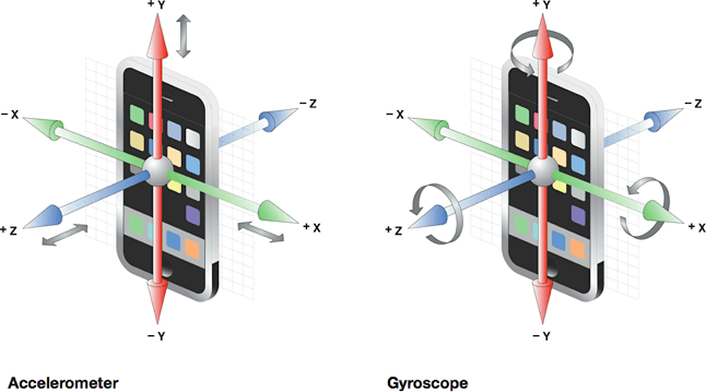 As shown in Figure 3-12, the accelerometer measures significant change in motion along x-, y-, and z-axes. The gyroscope measures angles of rotation around gravity.