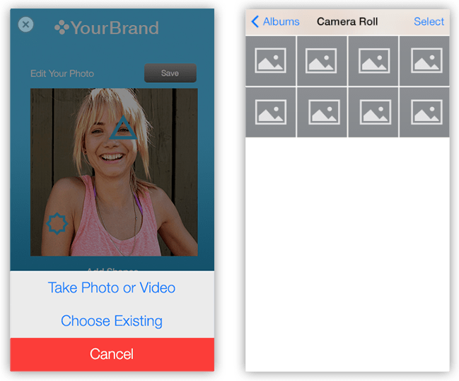 You can prompt users to capture a single photo or short video with their device’s camera for use within the ad, using either the front or back camera (when available). Figure 3-13 shows the Camera app’s photo view and video view.