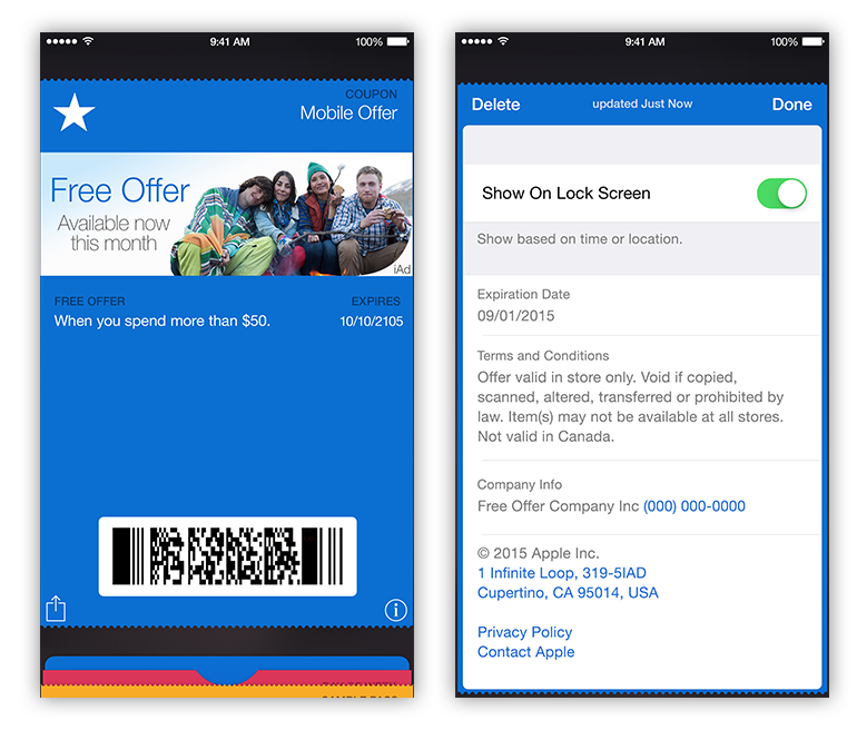 Wallet is a native app, included as part of iOS 7.0 for iPhone only. Wallet stores a user’s digital passes, replacing physical coupons and rewards cards you would otherwise keep in your wallet. A pass is a digital card that may be used to redeem goods/services or track activity on an account—such as gift cards, loyalty cards, coupons, and boarding passes. Users can save these digital cards from within an ad to the Wallet iOS app and then redeem them when they like.