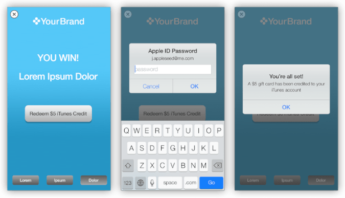Content promotions are a great way to engage users. Not only can your users purchase iTunes content within an ad, they can now redeem free content there. Available content includes iTunes songs (as shown in Figure 3-20), song credits, iTunes gift cards, Apple Online Store gift cards, and even Apple hardware (iPod, MacBook, Mac mini, iPad, and Apple TV).