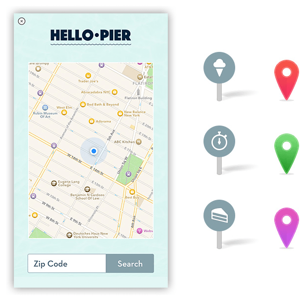 Embed a high-performance map in your ad and then use it to inform users of nearby places of interest. You can even reinforce your brand from within your map by using your own customized pins for map annotations and by highlighting specific geographic regions with a custom overlay (see Figure 3-4). With the user’s permission, you can also display the user’s current location. Not everyone will allow this, so you should provide zip code entry as an alternative.