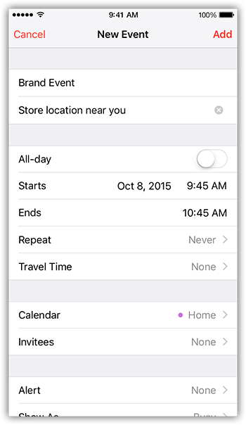 Consider pre-filling and presenting the standard calendar event view (see Figure 3-6) to users so that they can add an event to their calendar. Specify a name, date, location, and description for the event.