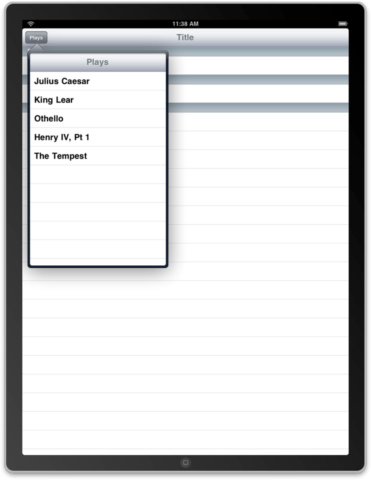 Figure 5-1 shows an example of a popover used to display a pane from a split view interface. Selecting a play from the popover causes the app’s main view to display information about that play. (For more information about creating a split view interface, see Split View Controllers.)