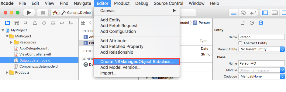 Choose Editor > Create NSManagedObject Subclass… as shown in Figure 2.