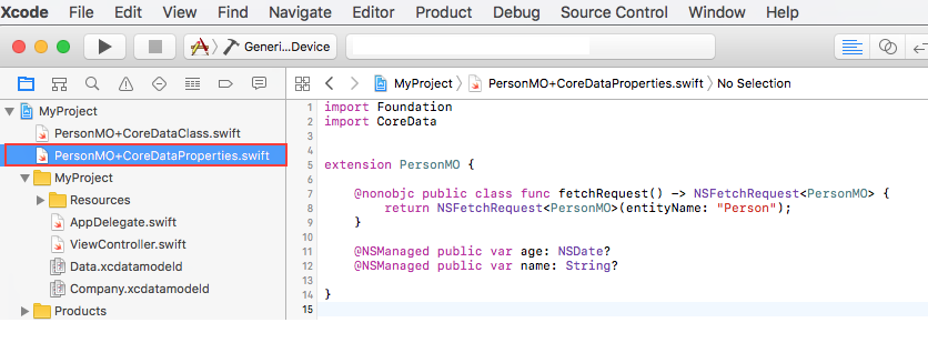 Xcode creates and saves files named ClassName+CoreDataClass and ClassName+CoreDataProperties for each of your selected entity in the selected location where ClassName is the name of your entity's NSManagedObject subclass. ClassName+CoreDataClass implements the NSManagedObject subclass as shown in Figure 6.