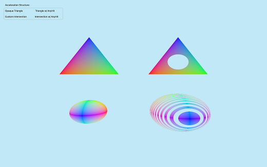 View sample codeExplicitly enumerate a ray’s intersections with acceleration structures by creating an intersection query object. The sample creates an acceleration structure containing both triangle geometry and custom sphere geometry. It then performs a ray/sphere intersection test when a ray hits a bounding box enclosing a sphere.
